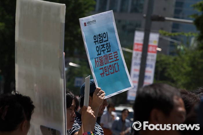 (서울=포커스뉴스) 2일 오전 서울 중구 서울시청 정문 앞에서 '서울시 지하철 하청노동자 사망재해 해결을 위한 시민대책위원회(가칭)'가 지하철 2호선 구의역 사고에 대한 책임자 처벌과 대책마련을 촉구하며 기자회견을 하고 있다.