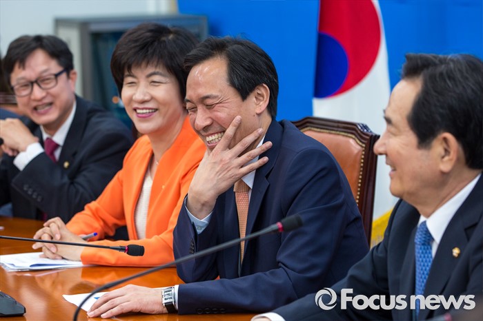 (서울=포커스뉴스) 우상호(오른쪽 두 번째) 더불어민주당 원내대표와 김영주(왼쪽 두 번째) 가계부채TF 단장을 비롯한 관계자들이 2일 오전 서울 여의도 국회에서 열린 '가계부채 TF 발족식'에 참석해 환하게 웃고 있다.