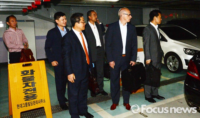 (서울=포커스뉴스) 2일 오후 서울 종로구 현대상선 본사에서 열린'G6' 해운동맹 회원사 협렵방안 회의에 참석한 제3 글로벌 해운동맹 디 얼라이언스 소속 해외 선사 관계자들이 회의를 마친 뒤 주차장에서 차량을 기다리고 있다.