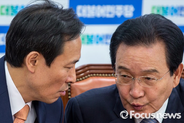 | △ 대화 나누는 우상호 더민주 원내대표-변재일 정책위의장 |