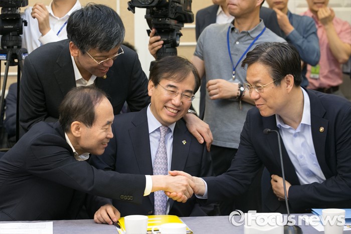 (서울=포커스뉴스) 2일 오전 서울 여의도 국회 귀빈식당에서 열린 미세먼지 대책 관련 당정협의에 참석한 장, 차관들이 인사하고 있다. 왼쪽부터 윤성규 환경부 장관, 최상목 기획재정부 1차관, 이석준 국무조정실장, 이관섭 산업통상자원부 1차관.