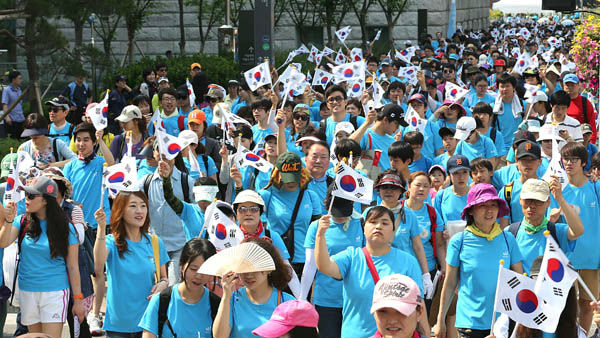 '나라사랑 고궁걷기대회'에 함께하고 싶다면 6월9일까지 공식홈페이지(www.hiwalking.co.kr)에서 온라인 참가 신청할 수 있다. 축제 당일 현장 부스에서 별도 접수 가능하다. 참가비는 성인 1만원, 청소년 8000원이다.2013년 6월6일 열린 제6회 '나랑사랑 고궁걷기대회' 참가자들이 태극기를 흔들며 한껏 즐거워하고 있다. <사진출처=나라사랑 고궁걷기대회 홈페이지>