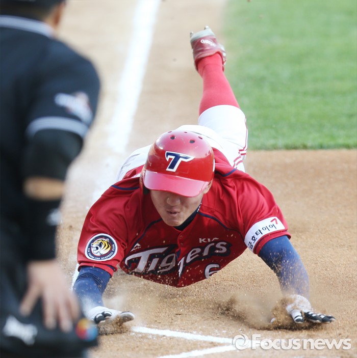 (서울=포커스뉴스) 2일 서울 잠실구장에서 열린 2016 프로야구 KIA-LG 경기 1회초 1사 3루에서 KIA 김주찬의 우익수 희생플라이때 3루주자 최원준이 홈에서 슬라이딩하며 득점하고 있다.