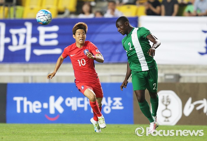 (수원=포커스뉴스) 2일 오후 경기 수원월드컵경기장에서 열린 2016 4개국 올림픽국가대표 축구대회 대한민국과 나이지리아의 경기에서 한국 류승우와 나이지리아 신시어 뮨츠 세스가 볼 경합을 하고 있다.