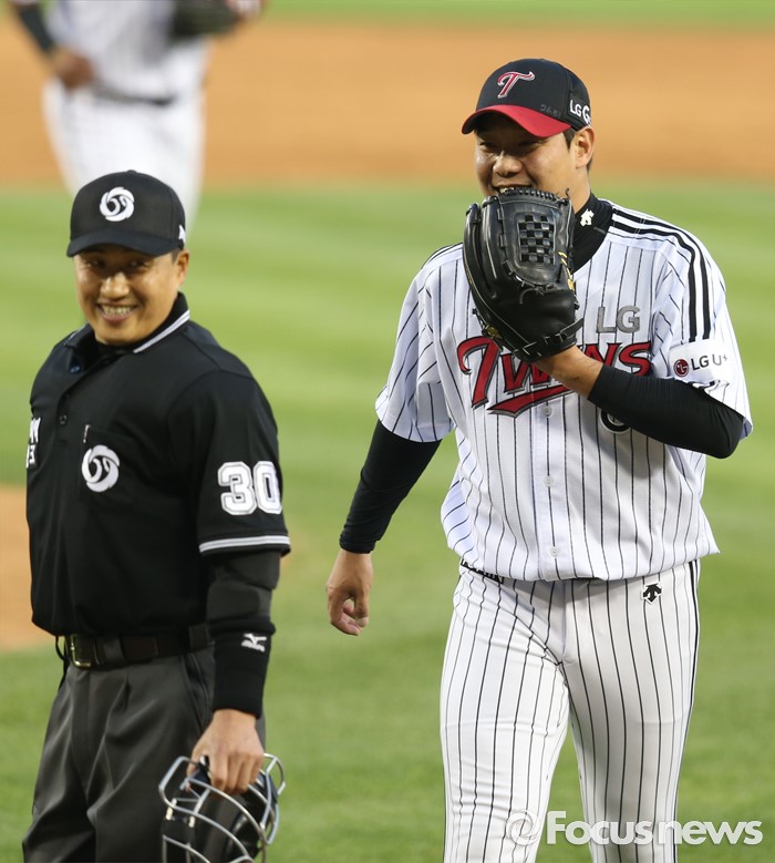 (서울=포커스뉴스) 2일 서울 잠실구장에서 열린 2016 프로야구 KIA-LG 경기에서 LG 투수 류제국이 4회 수비를 마치고 이용혁 주심과 활짝 웃으며 대화하고 있다.