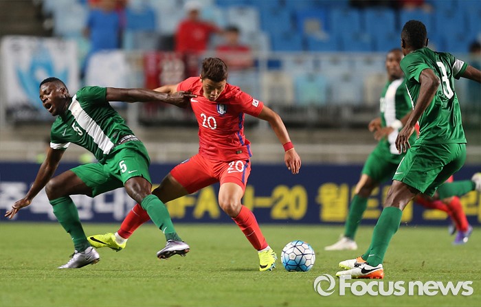 (수원=포커스뉴스) 2일 오후 경기 수원월드컵경기장에서 열린 2016 4개국 올림픽국가대표 축구대회 대한민국과 나이지리아의 경기에서 대한민국 황희찬이 상대 선수와 볼 다툼을 하고 있다.