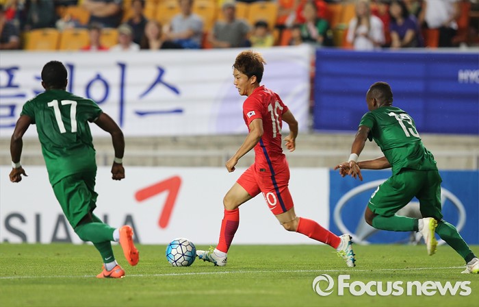 (수원=포커스뉴스) 2일 오후 경기 수원월드컵경기장에서 열린 2016 4개국 올림픽국가대표 축구대회 대한민국과 나이지리아의 경기에서 대한민국 류승우가 드리블을 하고 있다.
