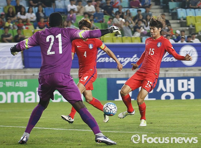 (수원=포커스뉴스) 2일 오후 경기 수원월드컵경기장에서 열린 2016 4개국 올림픽국가대표 축구대회 대한민국과 나이지리아의 경기에서 대한민국 최규백이 후반전 선제골을 성공시키고 있다.