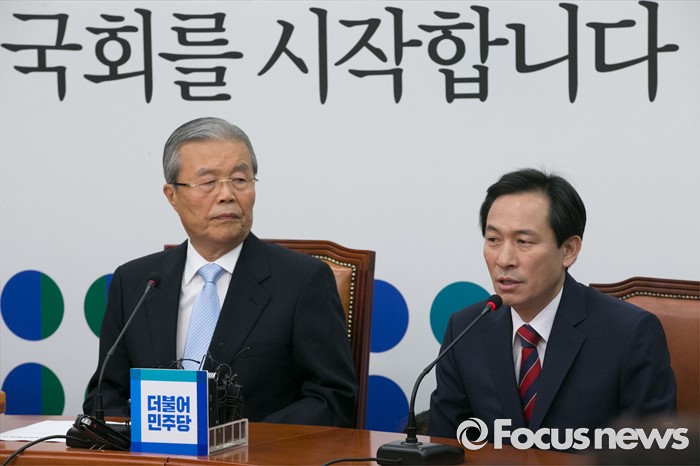 (서울=포커스뉴스) 3일 오전 서울 여의도 국회에서 열린 더불어민주당 비상대책위원회의에 참석한 우상호 원내대표가 발언을 하고 있다. 왼쪽은 김종인 비대위 대표.