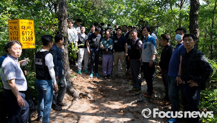 (서울=포커스뉴스) 지난 29일 서울 노원구 수락산 등산로에서 60대 여성을 살해한 피의자 김학봉(61)이 3일 오전 범행장소에 도착해 현장검증을 준비하고 있다.