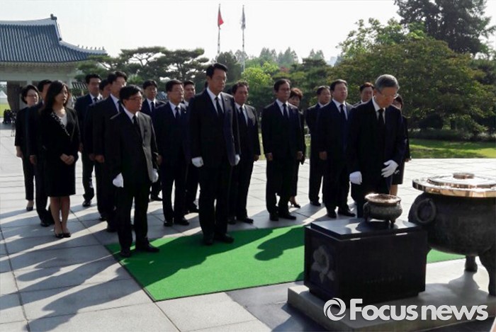 (서울=포커스뉴스) 김희옥 새누리당 혁신비대위원장과 정진석 원내대표 등이 3일 오전 동작구 국립서울현충원을 방문해 참배를 하고 있다.