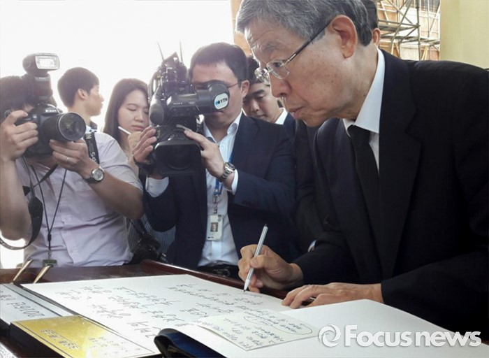 (서울=포커스뉴스) 김희옥 새누리당 혁신비대위원장이 3일 오전 동작구 국립서울현충원을 방문해 참배 후 방명록을 작성하고 있다.
