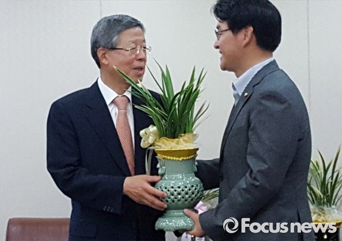 (서울=포커스뉴스) 김희옥(왼쪽) 새누리당 혁신비대위원장이 3일 오전 서울 여의도 당사에서 박용진 더불어민주당 당대표비서실장으로부터 김종인 비대위 대표가 보낸 축하난을 전달받고 있다.