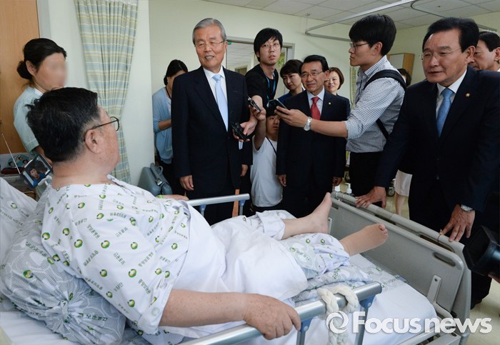(서울=포커스뉴스) 김종인 더불어민주당 비대위 대표가 현충일을 사흘 앞둔 3일 오후 서울 강동구 중앙보훈병원을 방문해 월남전에 참전했던 전백열(73, 상이 6급) 씨를 위문하고 있다.