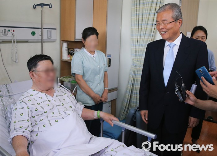 (서울=포커스뉴스) 김종인(오른쪽) 더불어민주당 비대위 대표가 현충일을 사흘 앞둔 3일 오후 서울 강동구 중앙보훈병원을 방문해 월남전에 참전했던 전백열(73, 상이 6급) 씨를 위문하고 있다.