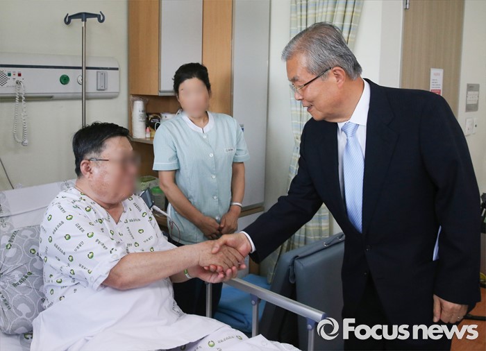 (서울=포커스뉴스) 김종인(오른쪽) 더불어민주당 비대위 대표가 현충일을 사흘 앞둔 3일 오후 서울 강동구 중앙보훈병원을 방문해 월남전에 참전했던 전백열(73, 상이 6급) 씨를 위문하고 있다.
