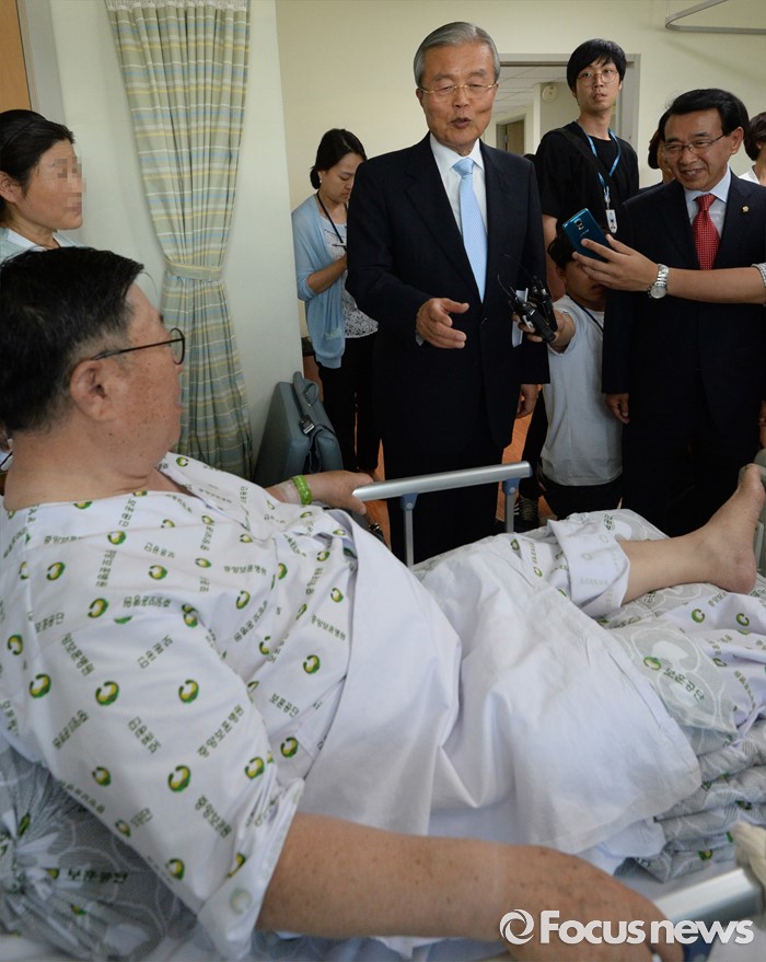 (서울=포커스뉴스) 김종인(가운데) 더불어민주당 비대위 대표가 현충일을 사흘 앞둔 3일 오후 서울 강동구 중앙보훈병원을 방문해 월남전에 참전했던 전백열(73, 상이 6급) 씨를 위문하고 있다.