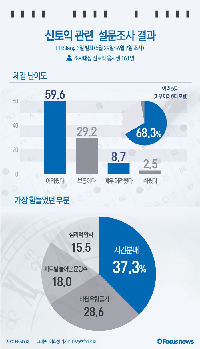 (서울=포커스뉴스) 3일 EBSlang 토익목표달성이 발표한 설문조사 결과에 따르면 신토익 응시생 중 68.3%가 어려웠다고 대답해 체감 난이도가 높아졌음이 확인됐다(어려웠다 59.6%, 매우 어려웠다 8.7%). 응시생들이 가장 어려워한 파트는 독해파트인 part7(42.9%)였고, 가장 힘들었던 부분으로는 시간 분배(37.3%)를 꼽았다.