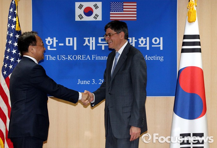 (서울=포커스뉴스) 3일 오후 종로구 정부서울청사에서 열린 한·미 재무장관회의에 참석한 유일호(왼쪽) 경제부총리 겸 기획재정부 장관과 제이콥 루(Jacob Lew) 미국 재무부 장관이 인사하고 있다.