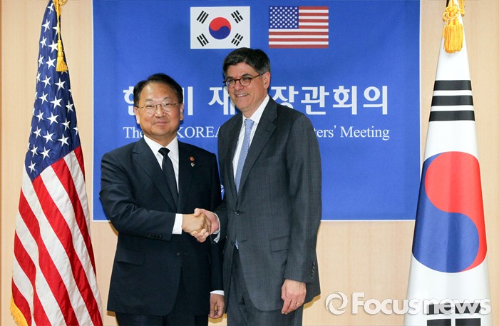 (서울=포커스뉴스) 3일 오후 종로구 정부서울청사에서 열린 한·미 재무장관회의에 참석한 유일호(왼쪽) 경제부총리 겸 기획재정부 장관과 제이콥 루(Jacob Lew) 미국 재무부 장관이 취재진을 향해 포즈를 취하고 있다.