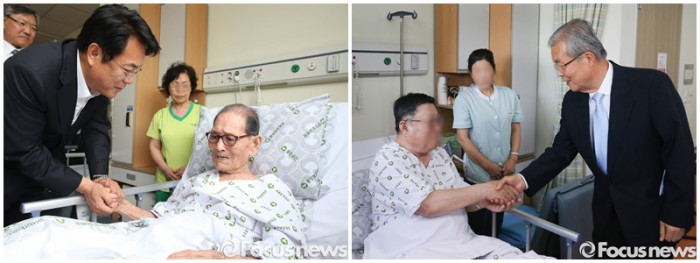 (서울=포커스뉴스) 정진석 새누리당 원내대표·김종인 더불어민주당 비상대책위원회 대표가3일 각각 참전용사들을 방문해 위로의 뜻을 전달했다.