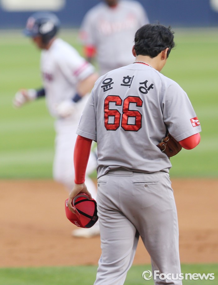 (서울=포커스뉴스) 3일 서울 잠실구장에서 열린 2016프로야구 SK-두산 경기 2회말 SK 투수 윤희상이 두산 에반스에게 홈런을 맞은후 뒤 돌아서 숨을 고르고 있다.
