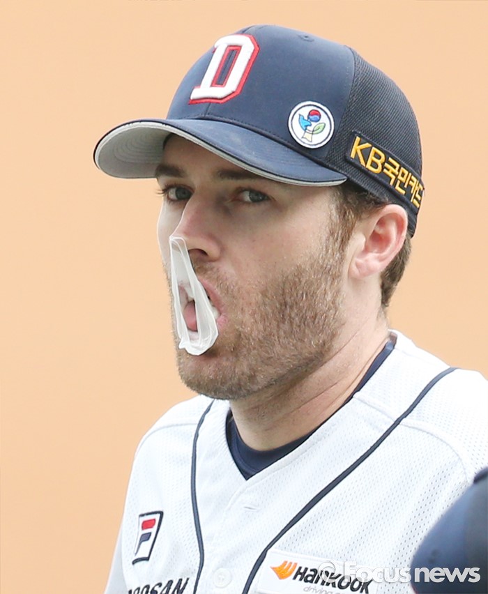 (서울=포커스뉴스) 3일 서울 잠실구장에서 열린 2016프로야구 SK-두산 경기에서 두산 에반스가 경기 시작을 기다리며 풍선 껌을 씹고 있다.