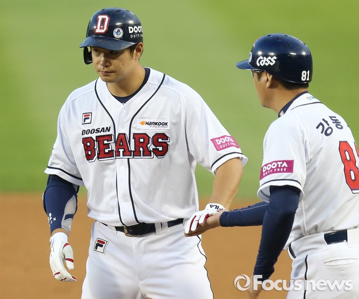 (서울=포커스뉴스) 3일 서울 잠실구장에서 열린 2016프로야구 SK-두산 경기 3회말 1사 만루에서 두산 김재환이 1타점 우전 안타를 치고 1루에서 강동우 코치의 축하를 받고 있다.