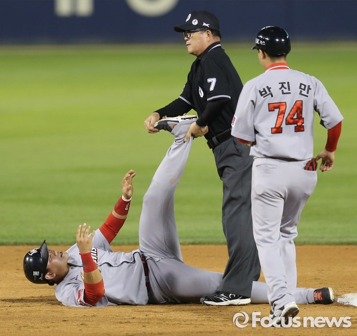 (서울=포커스뉴스) 3일 서울 잠실구장에서 열린 2016프로야구 SK-두산 경기에서 5회초 SK 2루주자 최승준이 다리에 쥐가 나 고통스러워 하자 문승훈 2루심이 근육을 당겨 풀어주고 있다.