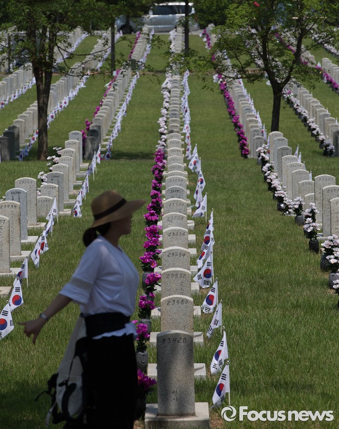 (서울=포커스뉴스) 현충일을 하루 앞둔 5일 오전 서울 동작구 국립서울현충원을 찾은 유족들이 묘역에 참배하고 있다.