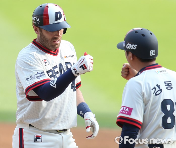 (서울=포커스뉴스) 5일 서울 잠실구장에서 열린 2016프로야구 SK-두산 경기 1회말 1사 1,3루에서 두산 에반스가 좌중간 적시타을 때리고 1루에서 강동우 코치의 축하를 받고 있다.