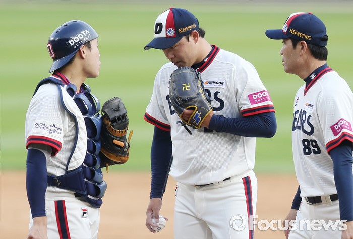 (서울=포커스뉴스) 5일 서울 잠실구장에서 열린 2016프로야구 SK-두산 경기에서 두산 투수 안규영(가운데)이 5회초 2사 1루에서 SK 김성현에게 2루타를 맞은뒤 한용덕 코치가 마운드에 올라가 침착하게 투구할 것을 주문하고 있다.