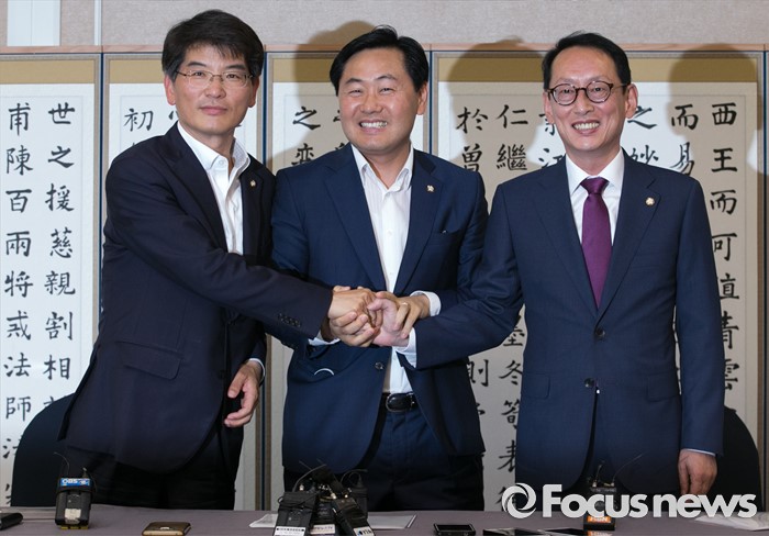(서울=포커스뉴스) 6일 오후 서울 여의도 국회 귀빈식당에서 열린 20대 국회 원구성 협상 등을 위한 회동에 참석한 김도읍(오른쪽) 새누리당 원내수석부대표, 박완주(왼쪽) 더불어민주당 원내수석부대표, 김관영 국민의당 원내수석부대표가 취재진을 향해 포즈를 취하고 있다.