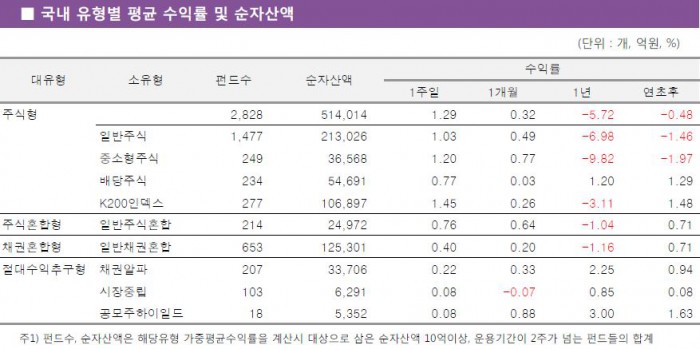 K200지수를 추종하는 K200인덱스펀드가 1.45% 상승하며 국내 주식형펀드 중 가장 우수한 성과를 보였다. 이어 중소형주식펀드가 1.20%의 수익률을 기록했고, 일반주식펀드와 배당주식펀드도 각각 1.03%, 0.77%씩 상승했다.