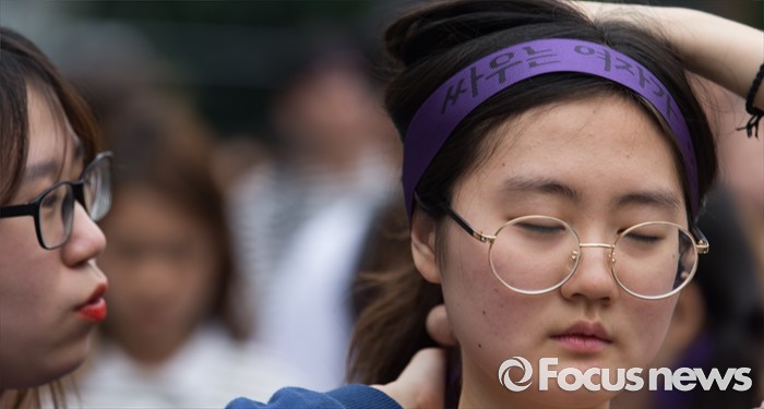 (서울=포커스뉴스) 6일 오후 서울 마포구 나루수산 앞 광장에서 열린 '여성 혐오에 저항하는 모두의 1차 공동행동-여성 혐오세상을 뒤엎자' 집회에 참석한 여성단체 회원이 머리에 보라색 리본을 매고 있다.