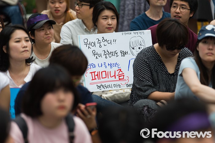 (서울=포커스뉴스) 6일 오후 서울 마포구 나루수산 앞 광장에서 열린 '여성 혐오에 저항하는 모두의 1차 공동행동-여성 혐오세상을 뒤엎자' 집회에 참석한 여성단체 회원이 여성 혐오를 규탄하는 손팻말을 들고 있다.