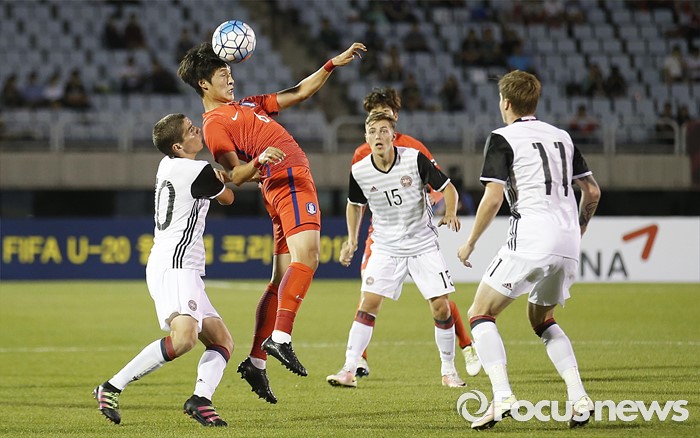 (부천=포커스뉴스) 6일 오후 경기 부천종합운동장에서 열린 2016 4개국 올림픽국가대표 축구대회 대한민국과 덴마크의 경기에서 대한민국 박용우가 상대 선수를 피해 헤딩하고 있다.