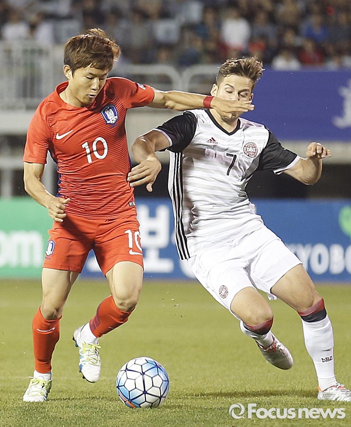 (부천=포커스뉴스) 6일 오후 경기 부천종합운동장에서 열린 2016 4개국 올림픽국가대표 축구대회 대한민국과 덴마크의 경기에서 대한민국 류승우가 드리블을 하고 있다.