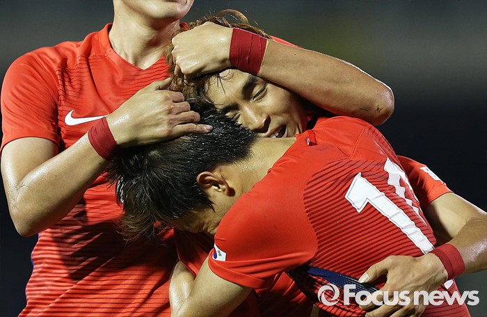 (부천=포커스뉴스) 6일 오후 경기 부천종합운동장에서 열린 2016 4개국 올림픽국가대표 축구대회 대한민국과 덴마크의 경기에서 대한민국 문창진이 선제골을 넣고 선수들과 환호하고 있다.