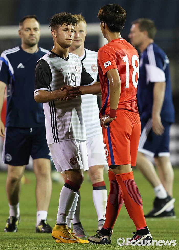 (부천=포커스뉴스) 6일 오후 경기 부천종합운동장에서 열린 2016 4개국 올림픽국가대표 축구대회 대한민국과 덴마크의 경기에서 양팀 선수들이 경기가 끝난 후 격려하고 있다.