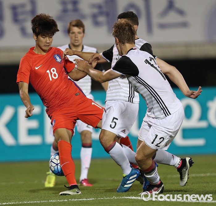 (부천=포커스뉴스) 6일 오후 경기 부천종합운동장에서 열린 2016 4개국 올림픽국가대표 축구대회 대한민국과 덴마크의 경기에서 대한민국 박인혁이 상대선수와 볼 다툼을 하고 있다.