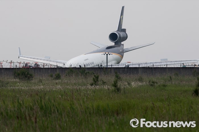 (영종도=포커스뉴스) 7일 오전 인천국제공항 활주로 부근에 UPS 소속 5X61편 화물기가 멈춰서 있다. 인천국제공항과 소방당국에 따르면 지난 6일 오후 10시 48분께 인천공항에서 미국 알래스카 앵커리지로 향할 예정이었던 화물기가 이륙 도중 바퀴가 파손돼 동체 앞 부분이 활주로를 부딪친 채 이동, 이륙에 실패했다고 밝혔다. 사고 직후 화물기에 탑승했던 조종사와 승무원 등 4명 모두 무사히 탈출한 것으로 알려졌다.