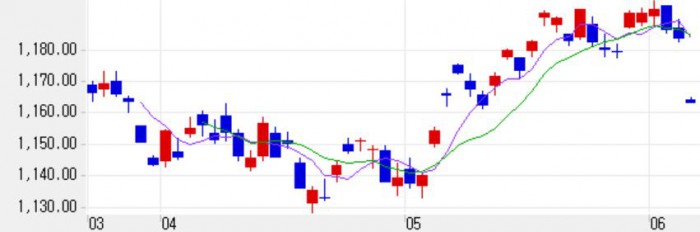또 불라드 총재는 5월 30일 한국을 방문해 "2분기 미국 국내총생산(GDP)를 살펴봐야한다"며 1분기 미국 GDP 서프라이즈에 대해 조심스런 의견을 비쳤다. 미국의 1분기 GDP 수정치는 연율 0.8% 증가로 예비치(0.5%)보다 0.3%포인트 올랐다.최근 4거래일 원·달러 환율 추이.<자료제공=미래에셋 HTS화면 캡처>