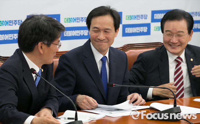 (서울=포커스뉴스) 7일 오전 서울 여의도 국회에서 열린 더불어민주당 원내대책회의에 참석한 우상호(가운데) 원내대표, 변재일(오른쪽) 정책위의장, 박완주 원내수석부대표가 대화하고 있다.