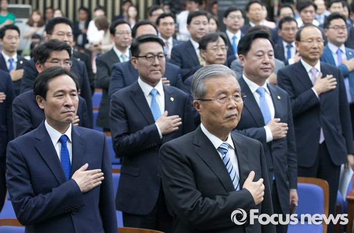 (서울=포커스뉴스) 7일 오전 서울 여의도 국회에서 열린 더불어민주당 의원총회에 참석한 김종인 비대위 대표, 우상호 원내대표 등 의원들이 국기에 대한 경례를 하고 있다.