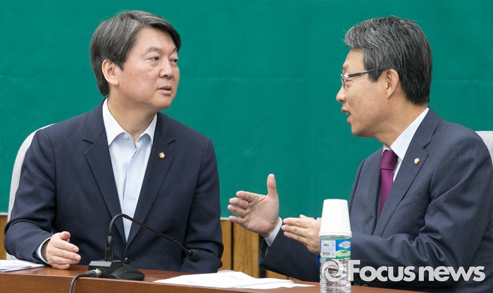 (서울=포커스뉴스) 7일 오전 서울 여의도 국회에서 열린 국민의당 의원총회에 참석한 안철수(왼쪽) 상임공동대표와 김성식 정책위의장이 대화하고 있다.