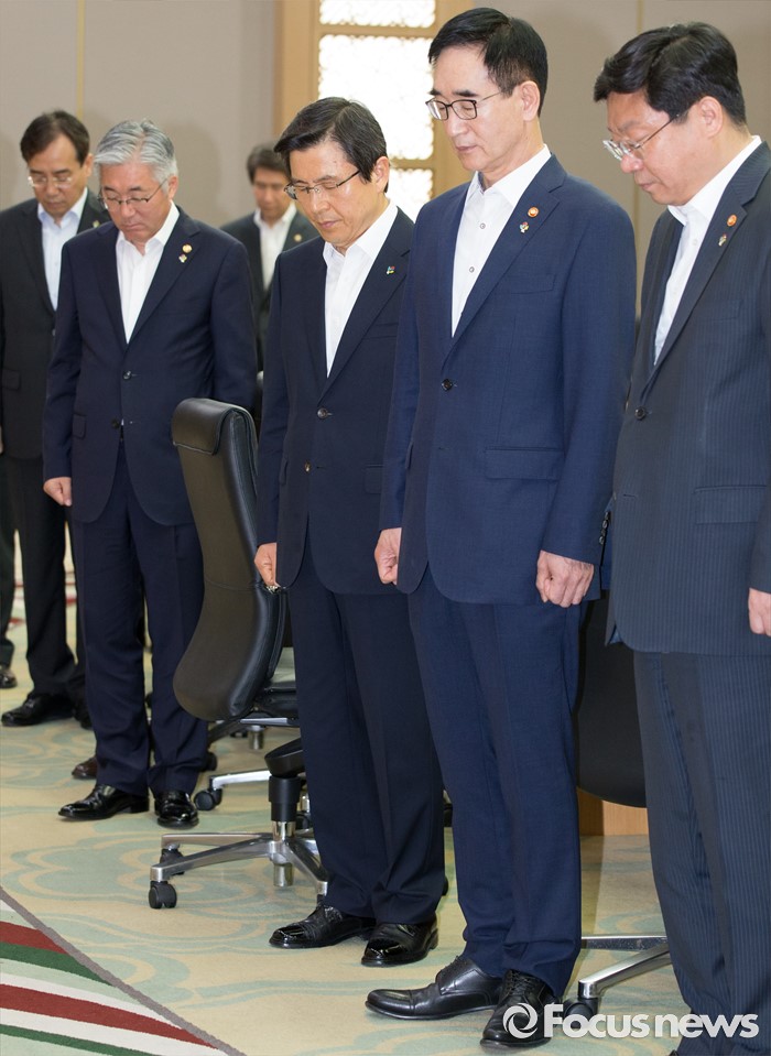 (세종=포커스뉴스) 황교안 국무총리와 국무위원들이 7일 오전 세종시 정부세종청사 국무회의장에서 열린 서울-세종 영상 국무회의에서 순국선열에 대한 묵념을 하고 있다.