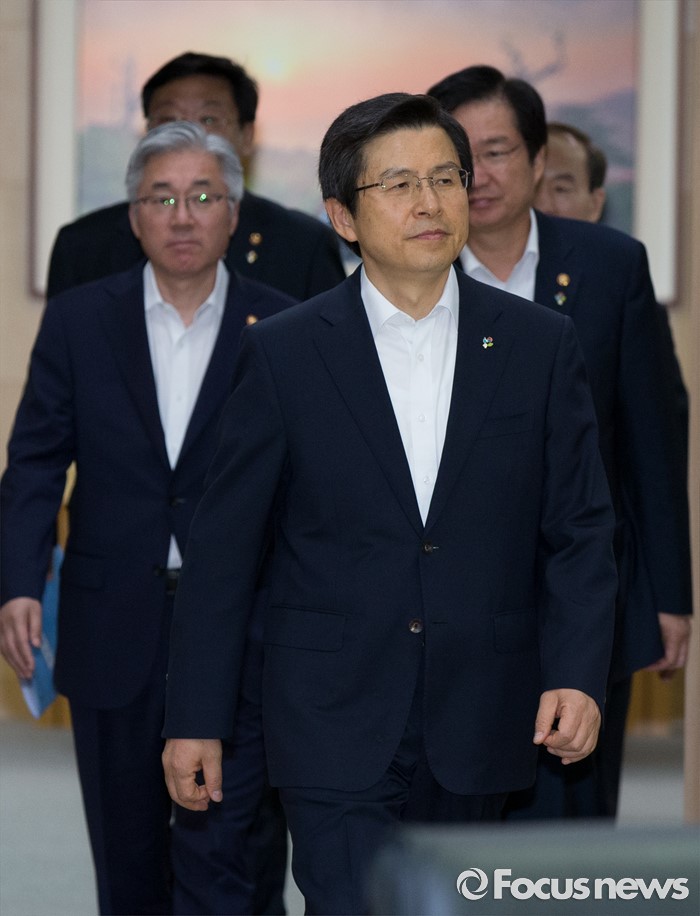 (세종=포커스뉴스) 황교안 국무총리가 7일 오전 세종시 정부세종청사 국무회의장에서 열린 서울-세종 영상 국무회의에 입장하고 있다.