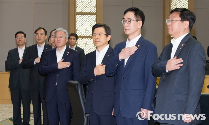 (세종=포커스뉴스) 황교안(오른쪽 세 번째) 국무총리와 국무위원들이 7일 오전 세종시 정부세종청사 국무회의장에서 열린 서울-세종 영상 국무회의에서 국기에 대한 경례를 하고 있다.