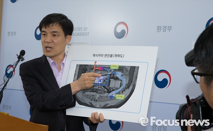 (세종=포커스뉴스) 홍동곤 환경부 교통환경과장이 7일 오전 세종시 정부세종청사 환경부 기자실에서 닛산 캐시카이 엔진룸 개략도를 보이며 엔진배기온도에 따른 배출가스 장치 작동여부에 대해 설명하고 있다.